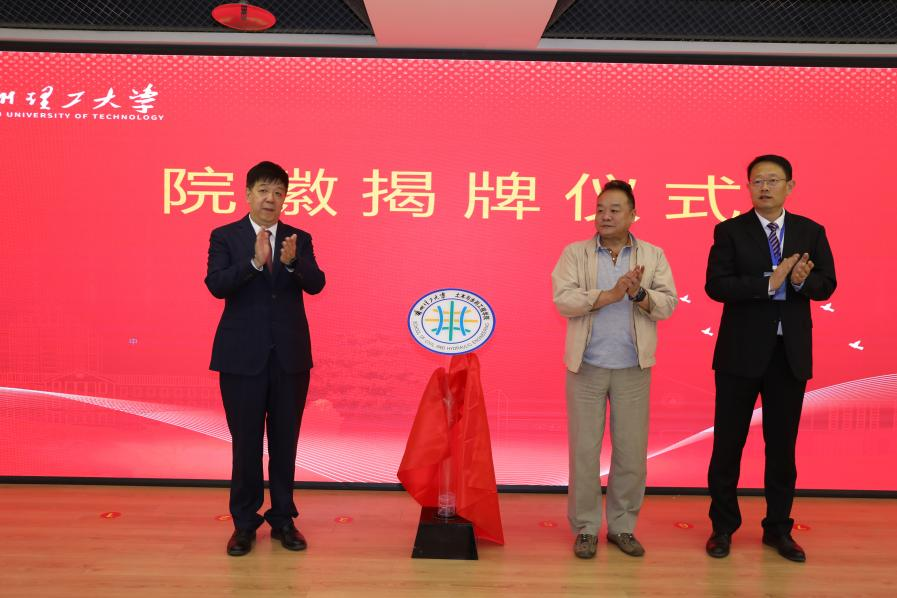 卢少卿书记、校友代表与学院党委书记赵炜共同为新院徽揭牌