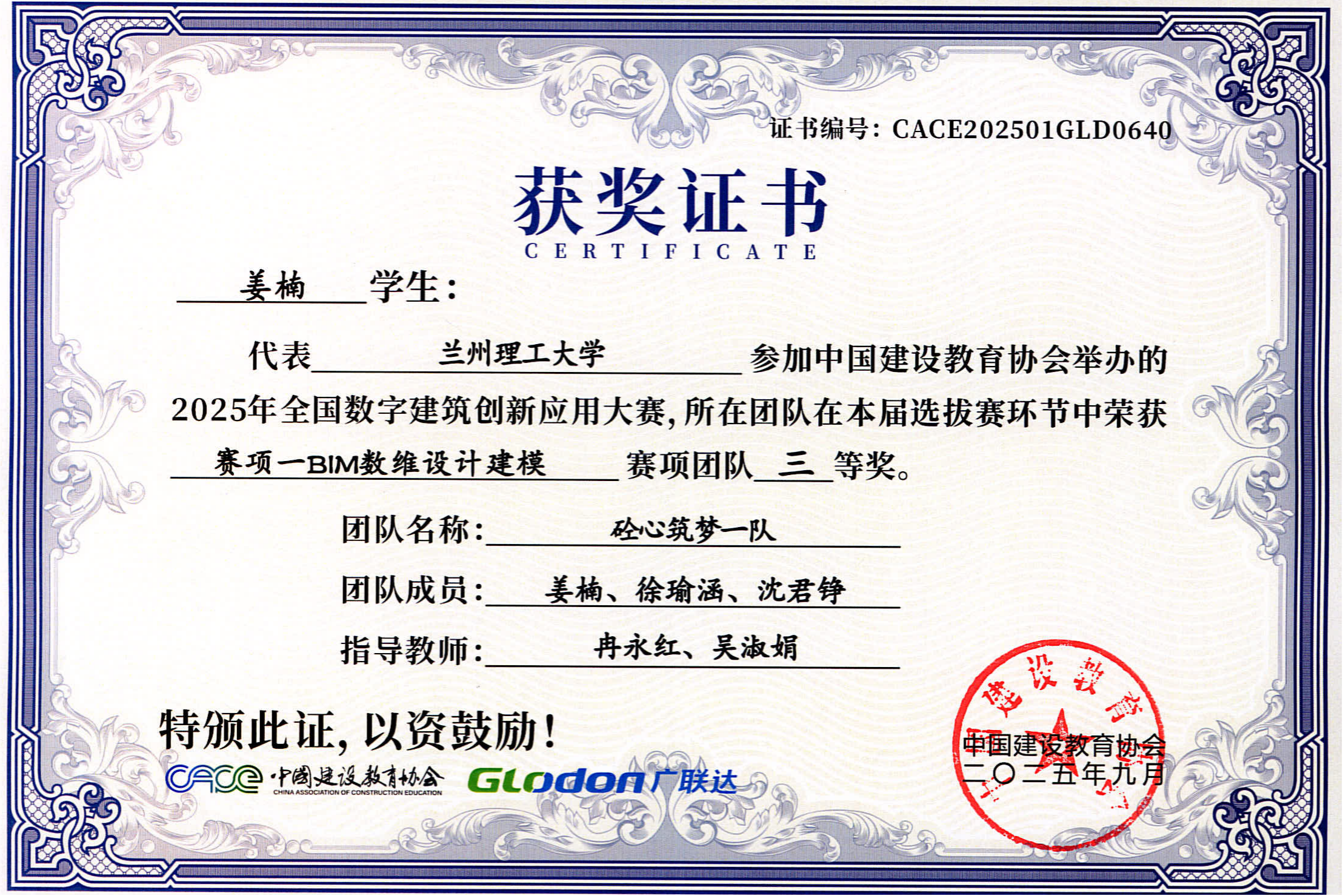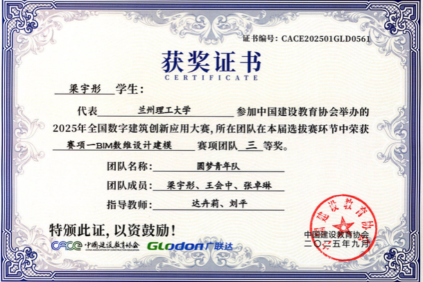 在备赛期间,学校创新创业学院和土木与水利工程学院给予了高度重视和大力支持,指派专业教师进行全程指导,为队员们取得优异成绩提供了坚实保障。兰州理工大学代表队最终荣获全国总决赛二等奖一项、三等奖一项,全国选拔赛三等奖两项、优秀奖四项,充分展现了我校学子在数字建筑领域的卓越实力和学校在面向行业前沿、推动学科交叉转型方面的前瞻布局与丰硕成果。