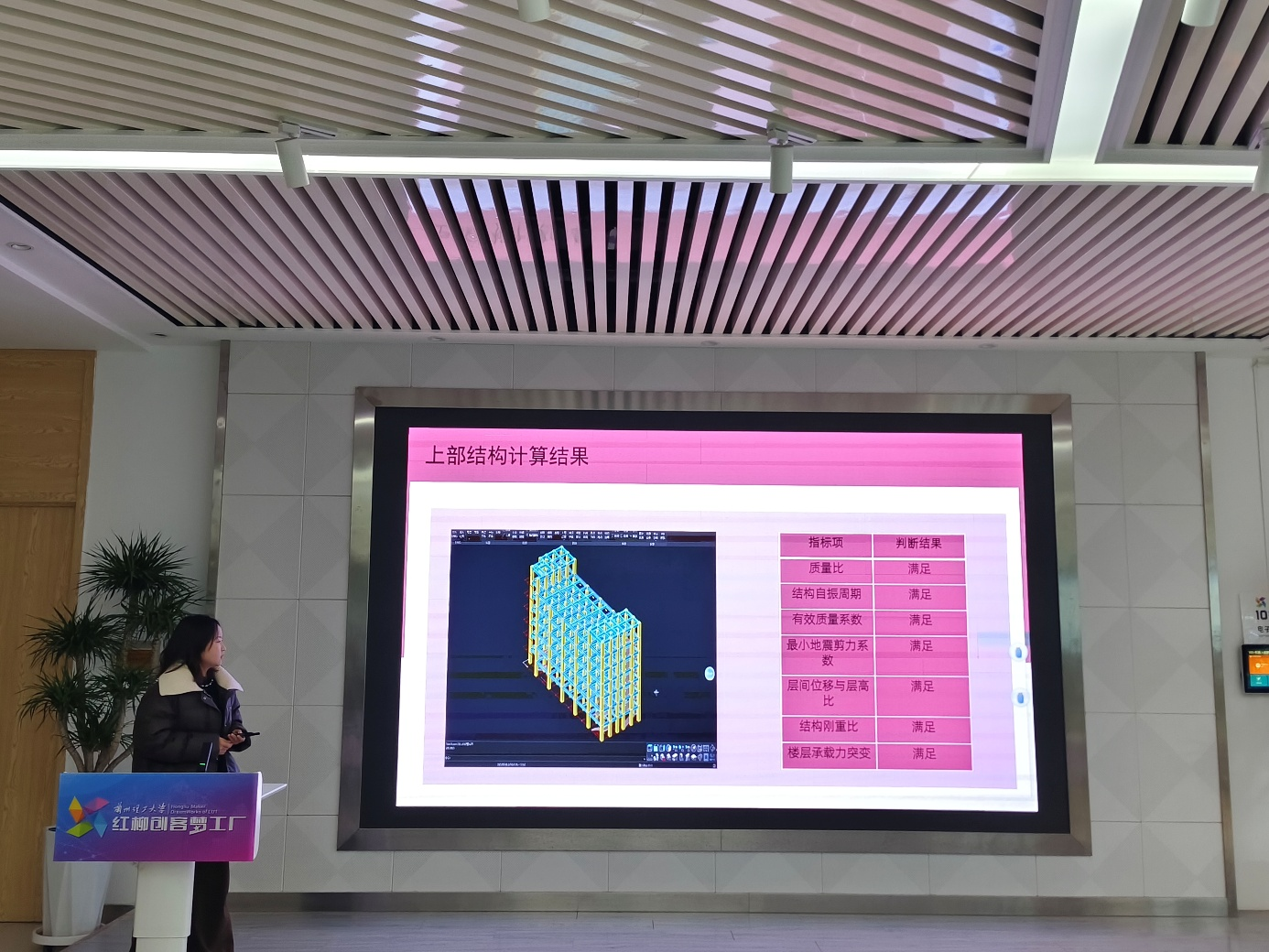 比赛特邀五位专业教师担任评委,依据各参赛小组提交的结构计算书、基础计算书、施工图、BIM模型及现场答辩表现等五个维度进行盲评打分。各参赛队伍通过PPT系统展示建模流程、成果亮点、技术难点与解决思路。评委老师针对软件操作、创新方法及实际工程问题进行提问,并给予具体指导与积极鼓励。经综合评定,最终评选出校赛一等奖6组、二等奖6组、三等奖6组,其中前12名的队伍获得晋级全国赛的资格。