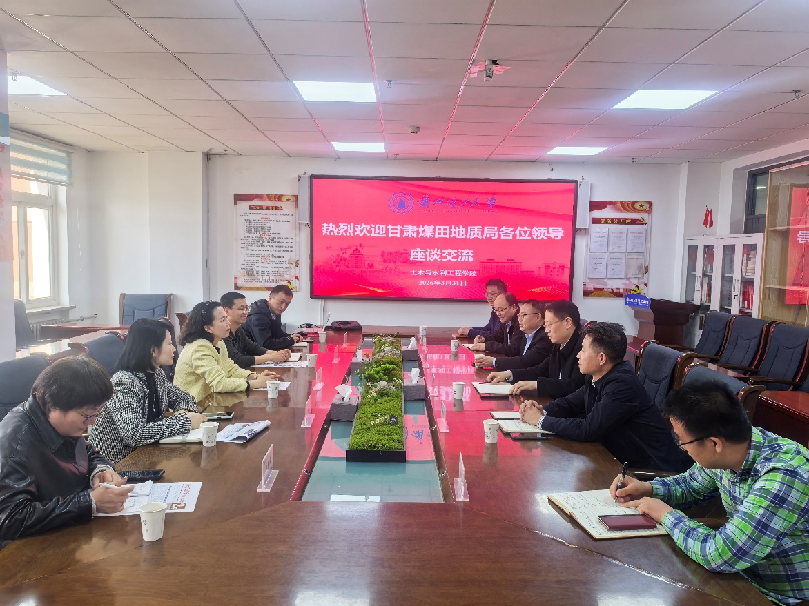 2026年3月31日,甘肃煤田地质局人事处处长王红霞、水文环境处副处长赵渊等一行5人来校开展毕业生招聘宣讲暨校企合作座谈。土木与水利工程学院党委书记赵炜主持会议,院长殷占忠、副书记王宝成及相关学科负责人、骨干教师代表参会,双方围绕毕业生招聘、人才培养、产学研合作等议题展开深入交流。