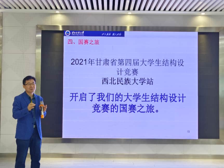 本次启动会特邀西北民族大学吴忠铁教授作关于全国大学生结构设计竞赛的专题讲座。吴老师结合自身团队从竞赛组织运行方式、校内实践平台建设、省赛之旅、国赛之旅、经验分享等5个方面系统介绍了竞赛团队9年的建设概况,剖析了从初次参赛到逐步成长再到国赛常客的成长过程,分享了模型制作技巧与备赛经验,并以结构选型和重点节点处理解码西北民族大学历年获得国赛一等奖的作品。吴老师勉励所有参赛队员不要有畏难情绪,要加强系统训练、细节处理、团队协作和经验传承,在竞赛集训中汲取成长所需的知识和快乐。