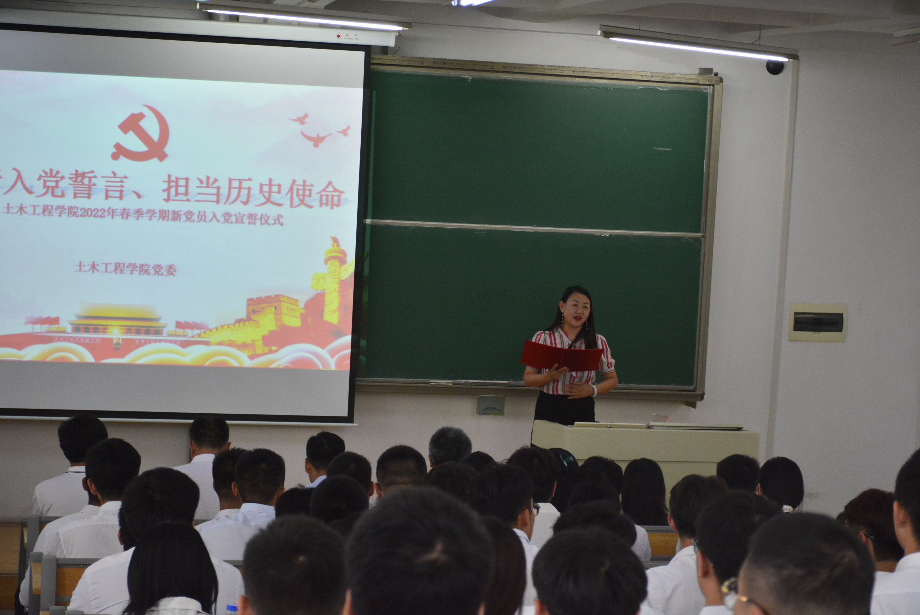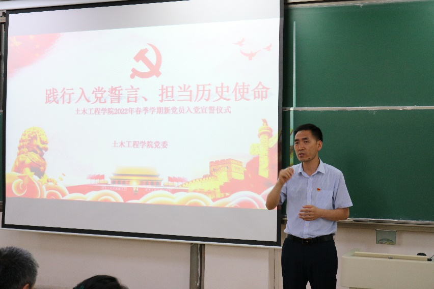 2022年6月28日,在即将迎来中国共产党成立101周年之际,土木工程学院党委在彭家坪校区集贤楼205教室举行了“践行入党誓词、担当历史使命”预备党员入党宣誓仪式。学院党委书记陈永泰、副书记王仪杰、全体学生党支部书记、部分老党员代表以及新发展的 106名预备党员参加了此次活动。