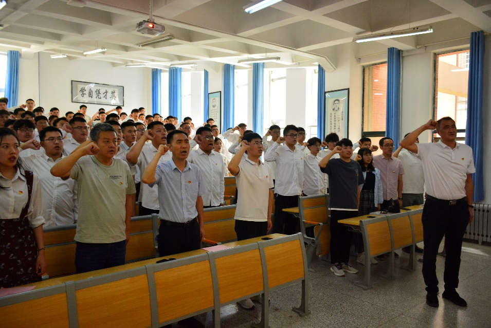 宣誓仪式在庄严的《国际歌》声中拉开了帷幕,首先,王仪杰同志宣读了新发展党员名单,与会的领导和老师为新党员佩戴了党员党徽。接着,全体党员面对鲜红的党旗,在领誓人的领誓下全体新党员庄严宣誓,老党员重温入党誓词,他们声音铿锵有力,展示着他们对党坚定不移的忠诚和为共产主义奋斗终身的决心和承诺。
