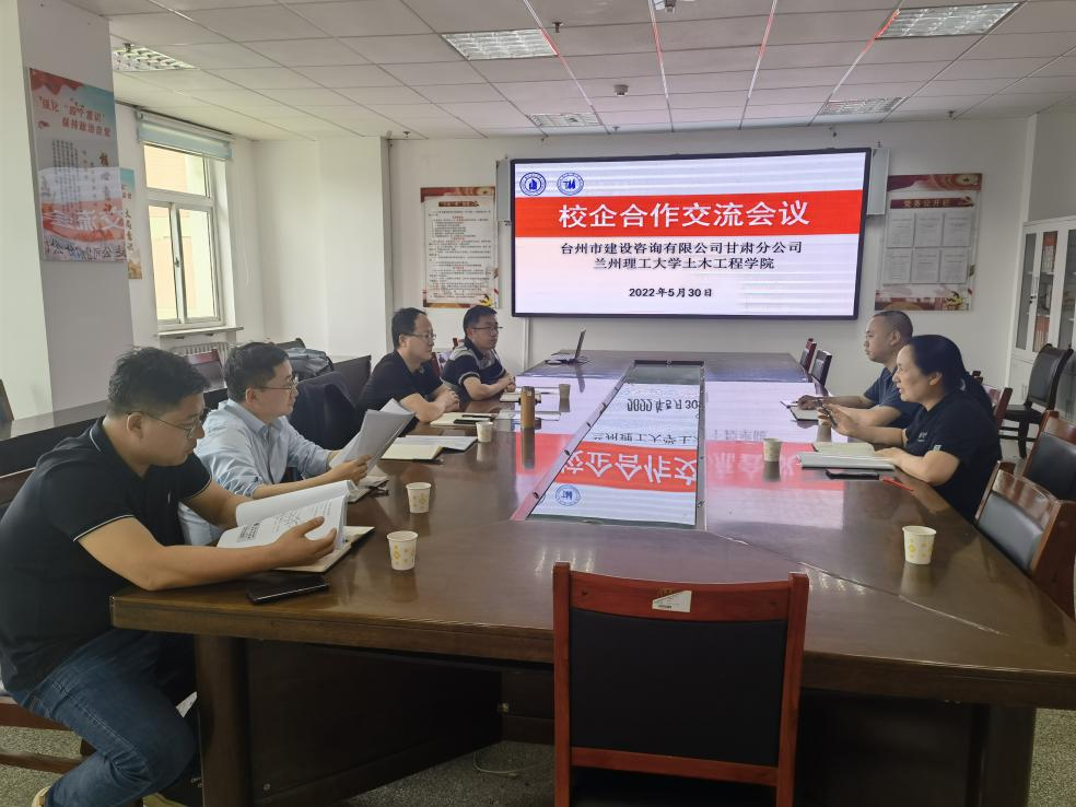 2022年5月30日下午,土木工程学院与台州市建设咨询有限公司校企合作座谈会在土木学院会议室举行。台州市建设咨询有限公司人力资源部总经理张亚珍,甘肃分公司总经理戴显义,土木工程学院院长王文达教授,副院长李万润教授,建筑工程系主任吴长副教授,王永胜副教授,工程管理系主任刘平副教授参加了座谈会。