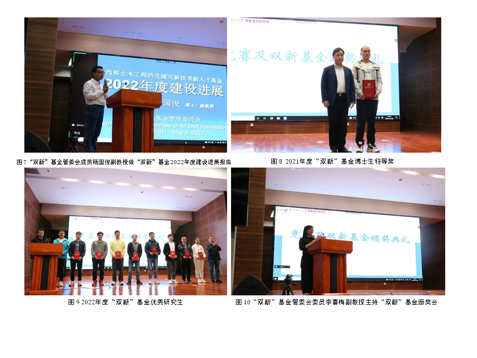颁奖仪式上,土木工程学院陈永泰书记宣读了“双新”基金2022年度课外科技创新优秀本科生奖的授奖决定。研究生院副院长何天虎教授宣读“双新”基金2022年度优秀硕士研究生奖和博士生奖的授奖决定。 “双新”基金管委会主席、甘肃省减隔震国际合作基地负责人杜永峰教授介绍“双新”基金2022年度评奖过程等背景信息。土木工程学院王仪杰副书记宣读甘肃省土木工程减震隔震国际科技合作基地2022年度大学生创新开放基金课题征集安排。“双新”基金管委会委员、甘肃省减隔震国际合作基地大学生创新教育委员会副秘书长杨国俊副教授做“双新”基金2022年度建设进展报告。