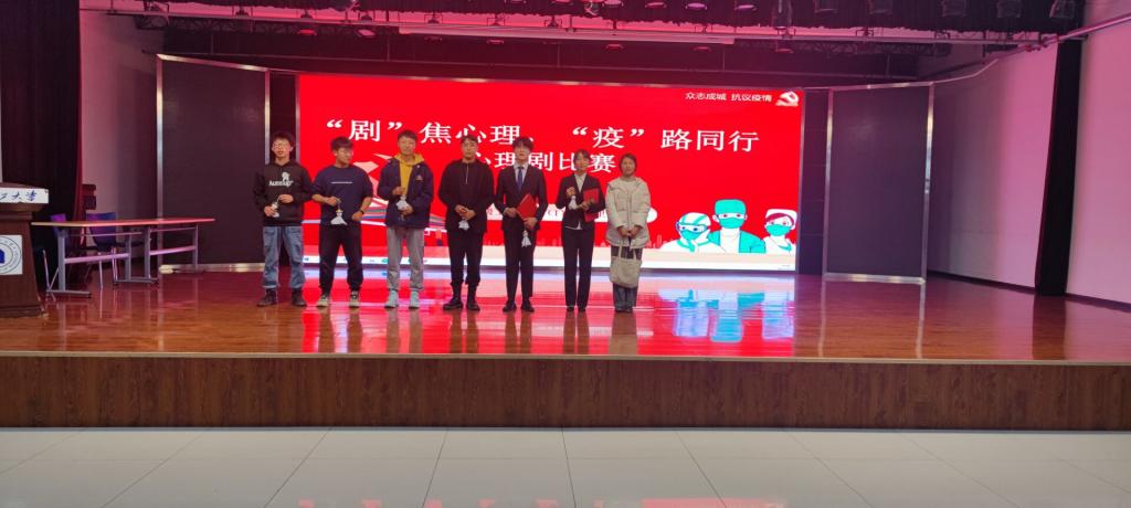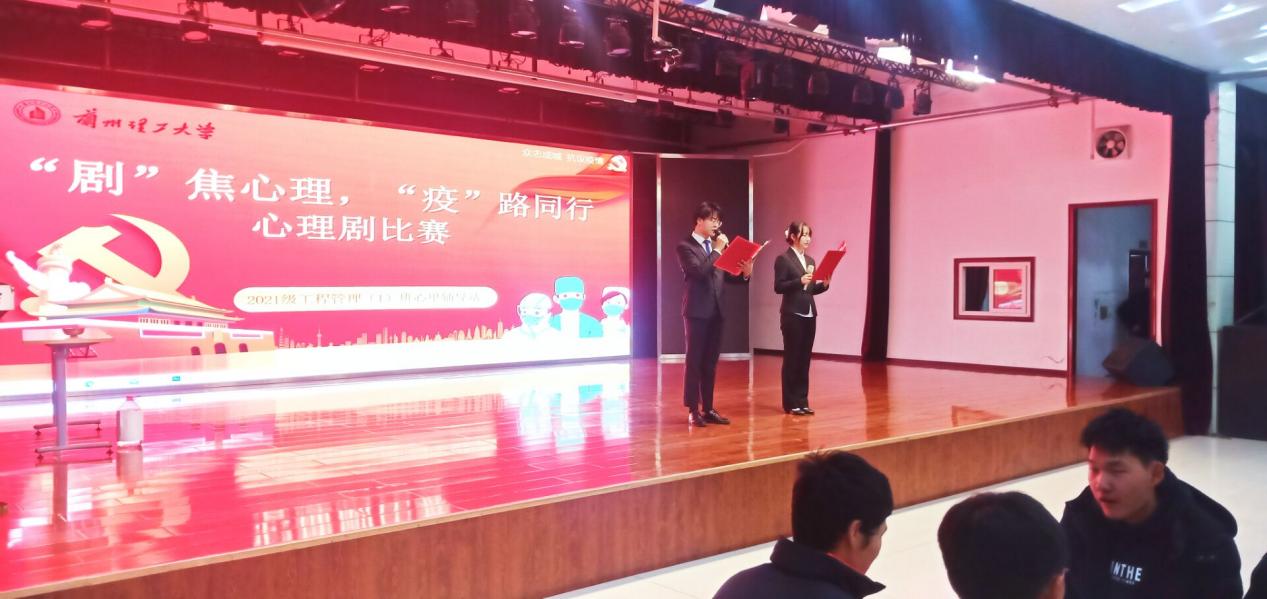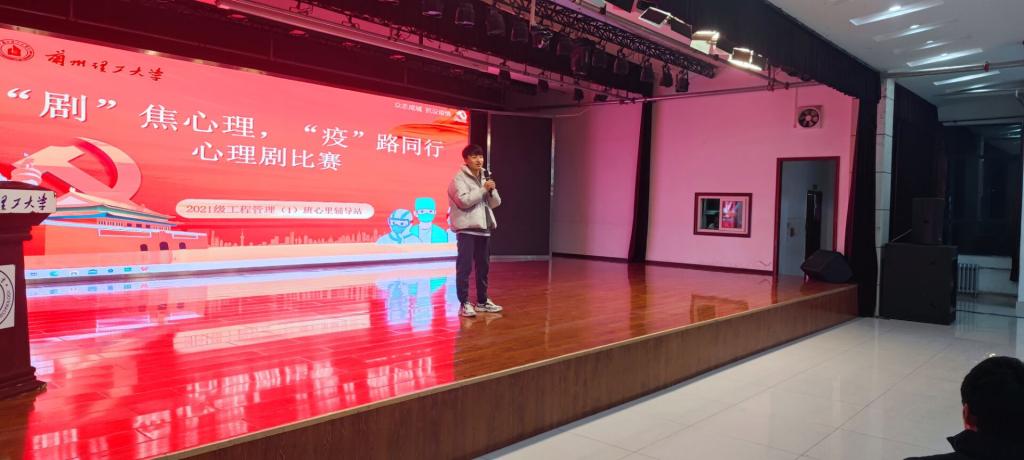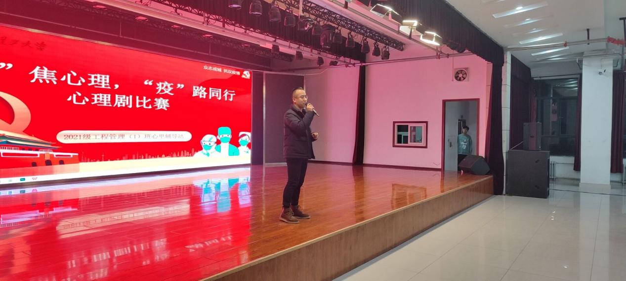 为进一步加强大学生心理教育,引导学生做好疫情期间科学防护,多措并举让学生成为自己生命第一责任人, 12月13日晚土木工程学院2021级工程管理(1)班心理辅导站在大学生活动中心举办“剧”焦心理,“疫”路同行主题心理剧比赛。本次活动工程管理(1)班全体同学参加,班主任买尔丹、辅导员徐金龙老师及学院心理辅导站代表担任评委,活动由潘星元、于芮主持。