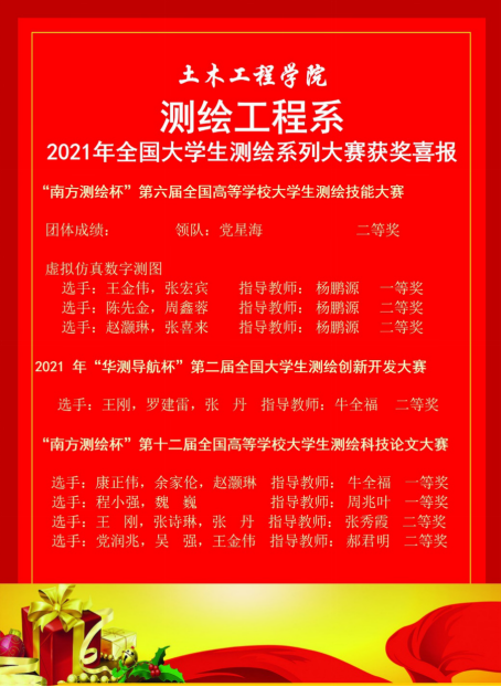7月28-31日,由全国高校测绘类专业竞赛联盟和自然资源部职业技能鉴定中心主办的2021年全国大学生测绘系列大赛决赛在贵州大学举行,本次决赛采用选手线上参赛、评委线下评审的模式。我校测绘学子在本次决赛的三类赛项中斩获8个奖项:测绘科技论文大赛一等奖2项、二等奖2项,虚拟仿真数字测图大赛一等奖1项、二等奖2项,测绘创新开发大赛二等奖1项。