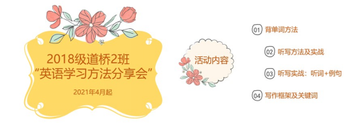 冯微老师通过介绍背单词APP和单词举例,给学生介绍了利用对比和词根词缀方法记忆单词的方法,并强调了单词复习的重要性;然后利用现场精听实战的练习,讲授了如何利用听力材料进行精听练习的方法;同时讲解了英语考试中作文框架,分享了若干句型和词汇的总结。学生们通过现场练习,对所教方法得到了初步掌握,表示在后续练习中继续精进练习。