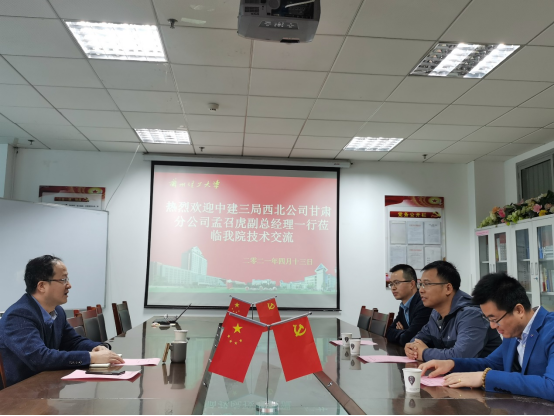 2021年4月13日上午,中建三局西北公司甘肃分公司孟召虎副总经理一行莅临我院进行技术交流和协商校企合作事宜,王文达院长介绍了土木工程学院的总体情况、学生就业及科研、社会服务技术优势等方面的内容,孟召虎副总经理和汉光昭技术部经理以及魏万龙项目经理分别介绍了中建三局西北公司甘肃分公司发展现状和业务范围及技术需求等方面的内容。