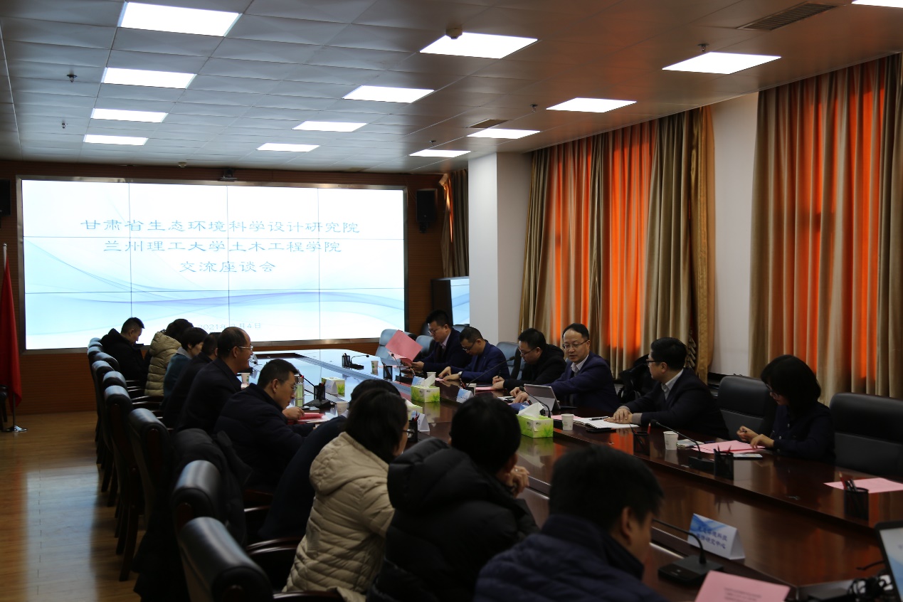 王文达院长对省环科院的热情接待表示感谢,并介绍了兰州理工大学土木工程学院师资力量、教学科研平台、获奖情况、学科建设、学科方向及相关科研工作开展情况,王亚军主任就可持续水环境与生态保护方向的前期研究工作及成果进行了汇报。