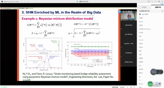 倪教授报告的题目是“大数据和机器学习驱动的结构健康监测(Structural health monitoring driven by big data and machine learning)”,介绍了在机器学习和基于大数据的结构健康监测的国际研究进展,讲述了由他主持的高速铁路、高层建筑和大型桥梁结构的传感器布置、结构损伤状态评级等议题易损性分析方法等健康监测的主要研究成果,并回答了听众关心的问题。报告会前,倪教授与基地负责人杜永峰教授进行线上交流,商讨与我校防震减灾研究团队项目合作事宜。