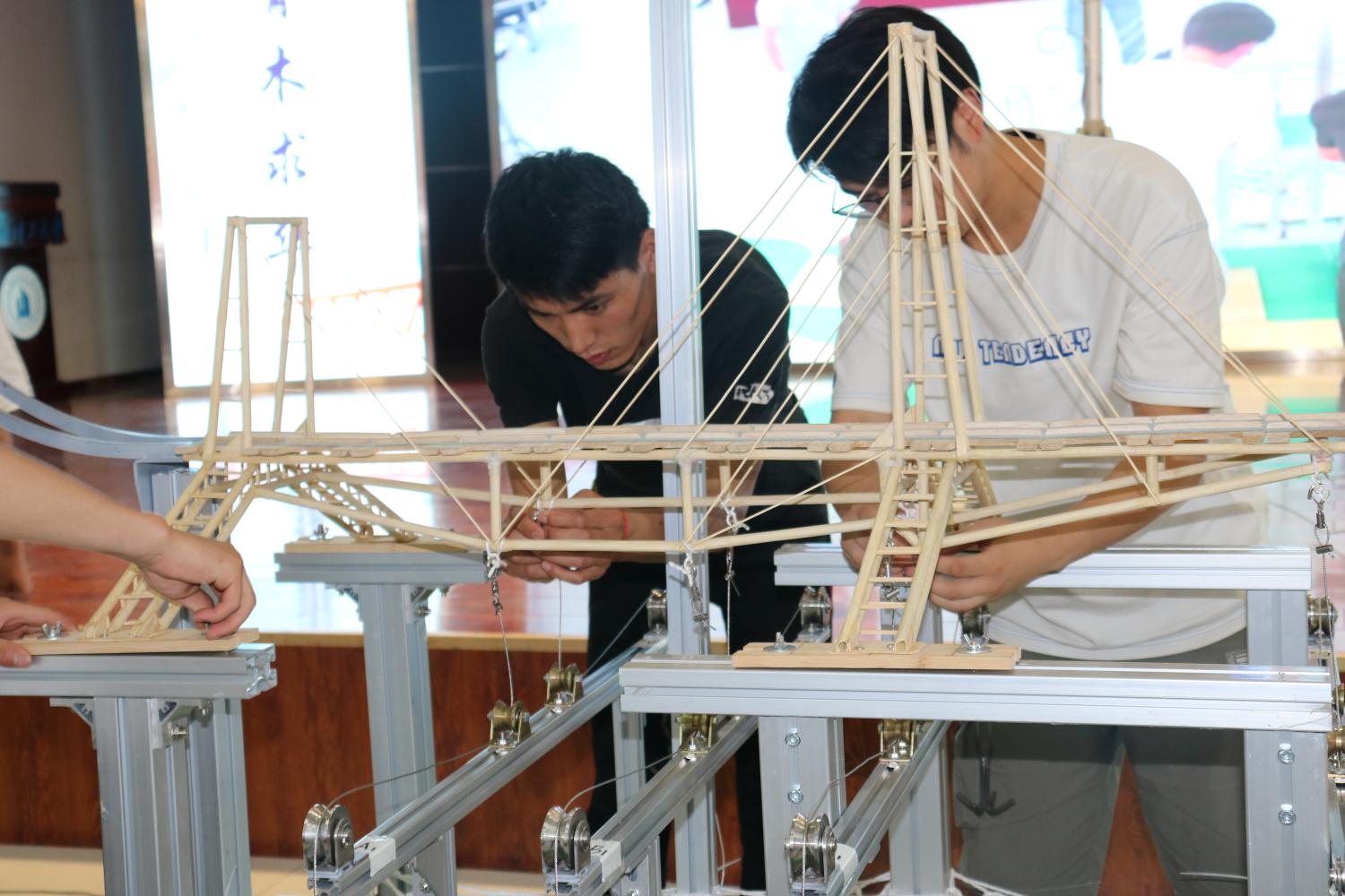 本次竞赛以“变参数桥梁结构模型设计与制作”为赛题,同学们利用课程所学知识,充分发挥想象,将充满灵性的创造力与理性的专业知识融合在一起,化成了一座座独特的桥梁结构模型。本次竞赛通过理论方案、模型制作、现场展示与答辩、加载表现四个方面进行综合评分。参赛同学在提交理论方案计算书后,在评委面前对本组作品进行展示与现场答辩,尔后开始激动人心的现场加载环节。整个竞赛过程紧张有序,精彩纷呈,充分展示了土木学子的专业知识运用以及创新、协作的能力。