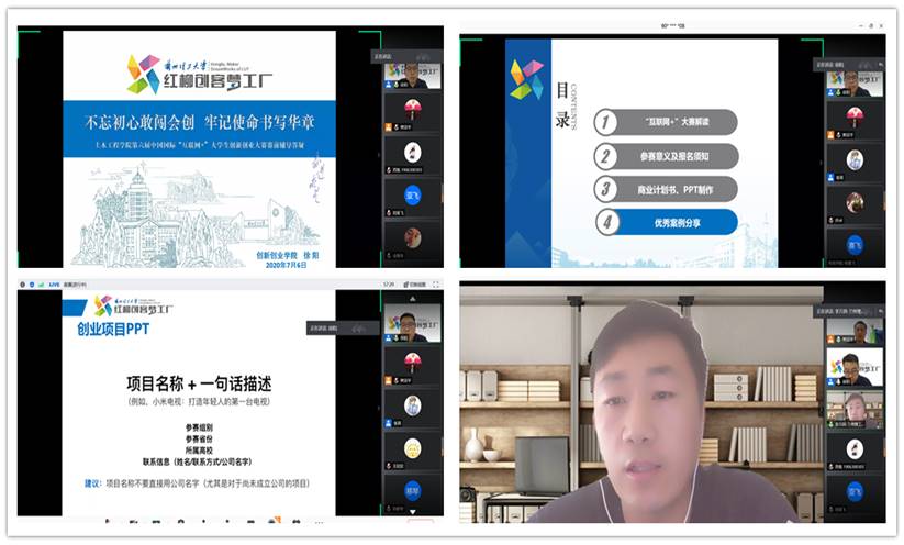 活动依托腾讯会议、网络直播平台开展。徐阳老师做了题为“不忘初心敢闯会创,牢记使命书写华章”的主题报告。报告从“互联网+”大赛的由来、学校互联网+大赛所取得的成绩、参加“互联网+”大赛意义、商业计划书撰写及答辩PPT制作、优秀案例分享等若干模块,对“互联网+”大赛进行了全面解读。