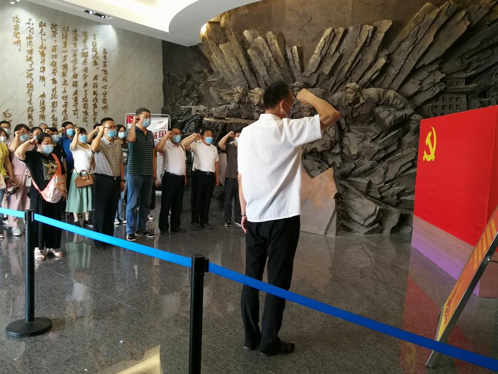 随后参观了兰州战役纪念馆,兰州战役纪念馆展馆面积1000平方米,由序厅、奏响西进序曲、实施千里追击、浴血南山之巅、聚歼青马主力、欢庆西北解放、结束语等七个部分构成。运用雕塑、油画、沙盘等表现手法再现了1949年8月解放兰州的全过程,讴歌了中国人民解放军第一野战军将士们浴血奋战、不怕牺牲的大无畏英雄主义。大家在纪念馆大厅面向党旗重温入党誓词,接受党性洗礼。随后,在讲解员的带领下,大家认真听取讲解、不时驻足凝望,详细了解兰州战役的全过程,重温那段悲壮激烈、波澜壮阔的峥嵘岁月。一幅幅精选的图片,一页页珍贵的文献,一件件实物,一个个复原的场景,吸引了大家的目光,思绪仿佛回到了71年前硝烟弥漫、革命先烈们浴血奋战的岁月。大家感慨万千,纷纷表示,今天来之不易的幸福生活是无数革命先烈用鲜血和生命换来的,必须倍加珍惜,牢记党的宗旨,继承和发扬党的光荣传统和优良作风,发挥共产党员先锋模范作用,立足工作岗位实际,认真践行初心使命。