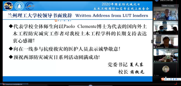 5月12日,既是国家防灾减灾日,又是国际护士节。针对今年的病毒蔓延引发全球公共卫生灾害特殊情形,兰州理工大学校校领导在活动开幕式上发表书面致辞,代表我校全体师生向以Paolo Clemente博士为代表的国内外土木工程防灾减灾工作者对我校土木工程学科的长期支持表达衷心感谢,向在一线参与抗疫救灾的医护人员表示诚挚敬意。