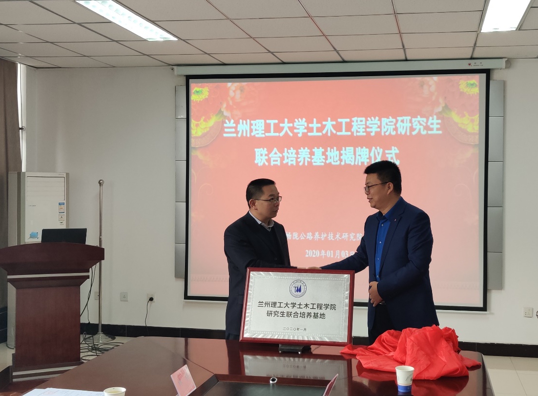 1月3日,“兰州理工大学土木工程学院研究生联合培养基地”揭牌仪式在甘肃畅陇公路养护技术研究院试验楼三楼会议室举行。土木学院院长周勇、副院长殷占忠、副院长李萍和学院教师代表,甘肃畅陇公路养护技术研究院张富奎董事长、杨小森经理、朱小明副经理、王斌副经理、魏定邦总工和研究院员工代表参加了揭牌仪式。