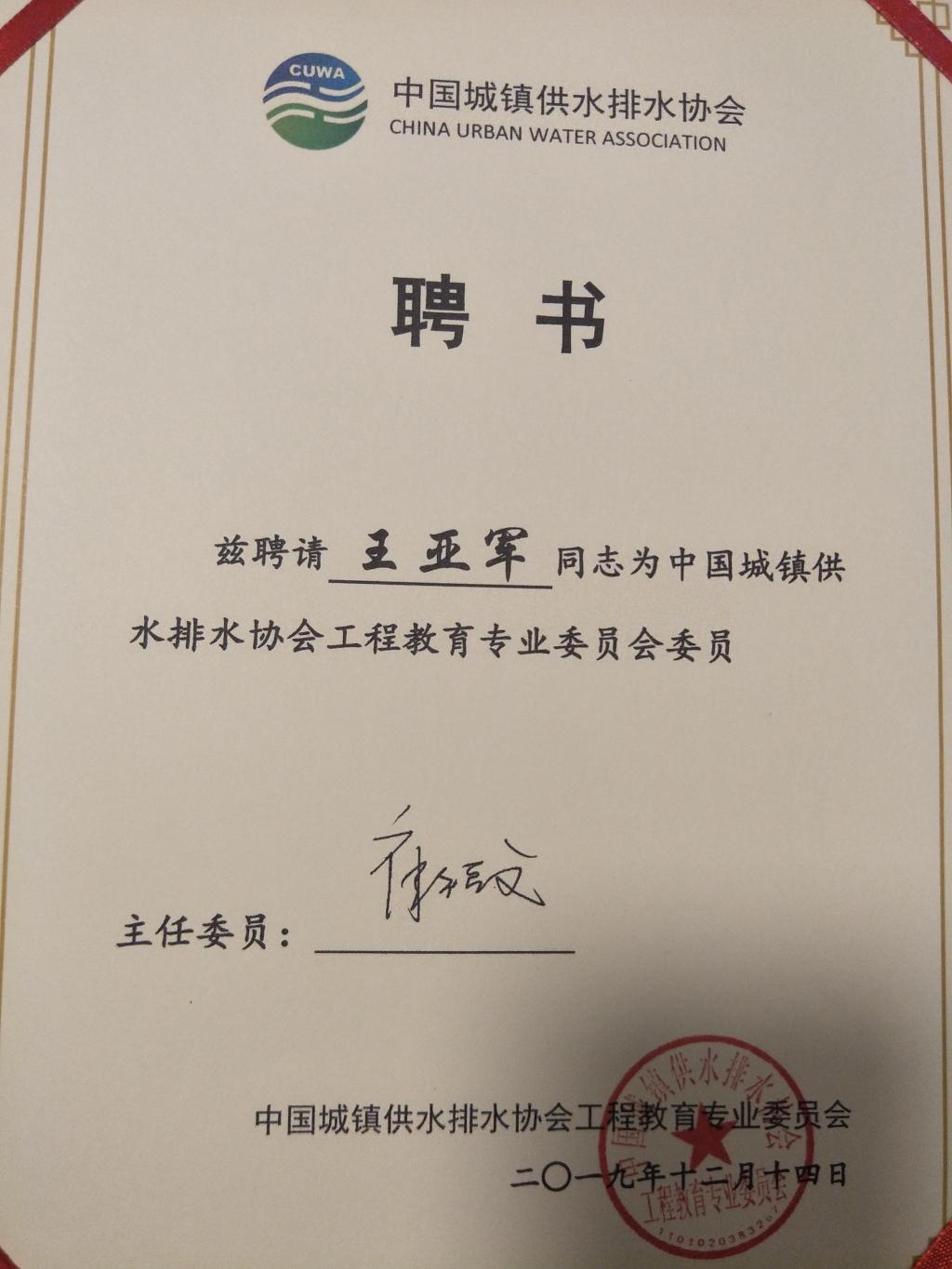 会上中国水协高伟副秘书长宣读了中国水协关于批准成立教育委的决定,中国水协章林伟会长发表讲话,进一步明确了委员会的工作职责,对委员会的工作提出了希望和要求。并宣布了中国水协教育委委员单位及委员名单,举行委员单位及委员证书颁发仪式。主任委员崔福义教授汇报了中国水协教育委筹备工作情况及工作计划。我校土木工程学院给排水科学与工程系主任王亚军获得了委员聘书。
