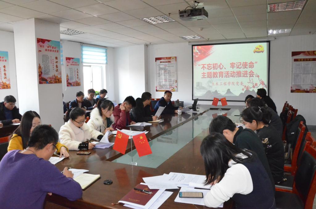 11月25日下午,土木工程学院在学院会议室召开“不忘初心、牢记使命”主题教育工作推进会。学院教工党支部书记、研究生党支部书记、本科生党支部书记参加会议,会议由学院党委书记田治学主持。