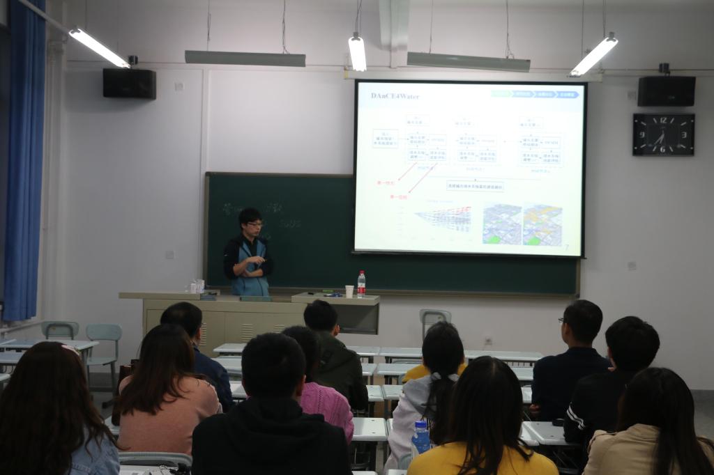 报告在轻松的氛围下展开,张博士分享了他博士期间研究的“自适应性优化的海绵城市排水系统远期规划方法研究”课题,围绕项目的背景、研究内容、结果讨论、总结展望等部分进行了阐述,并与研究生们就怎样开展科学研究和科研问题分析进行了充分的研讨,给研究生们提供了崭新的研究视角和创新方向。