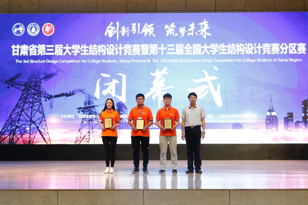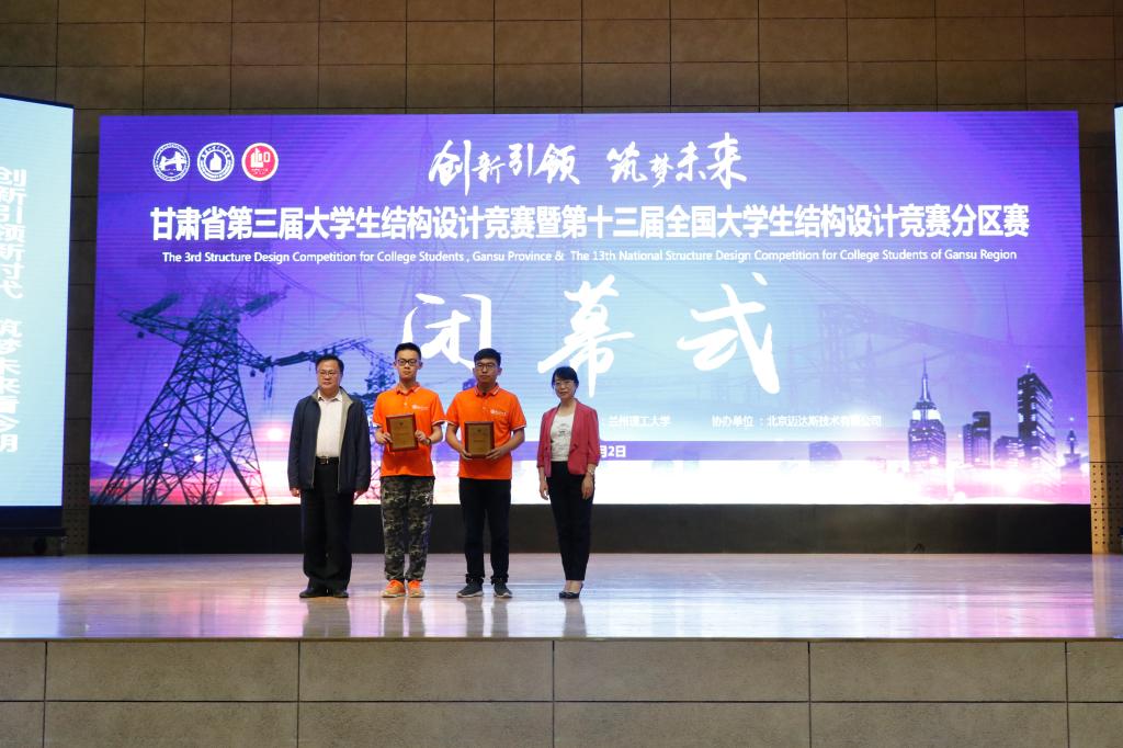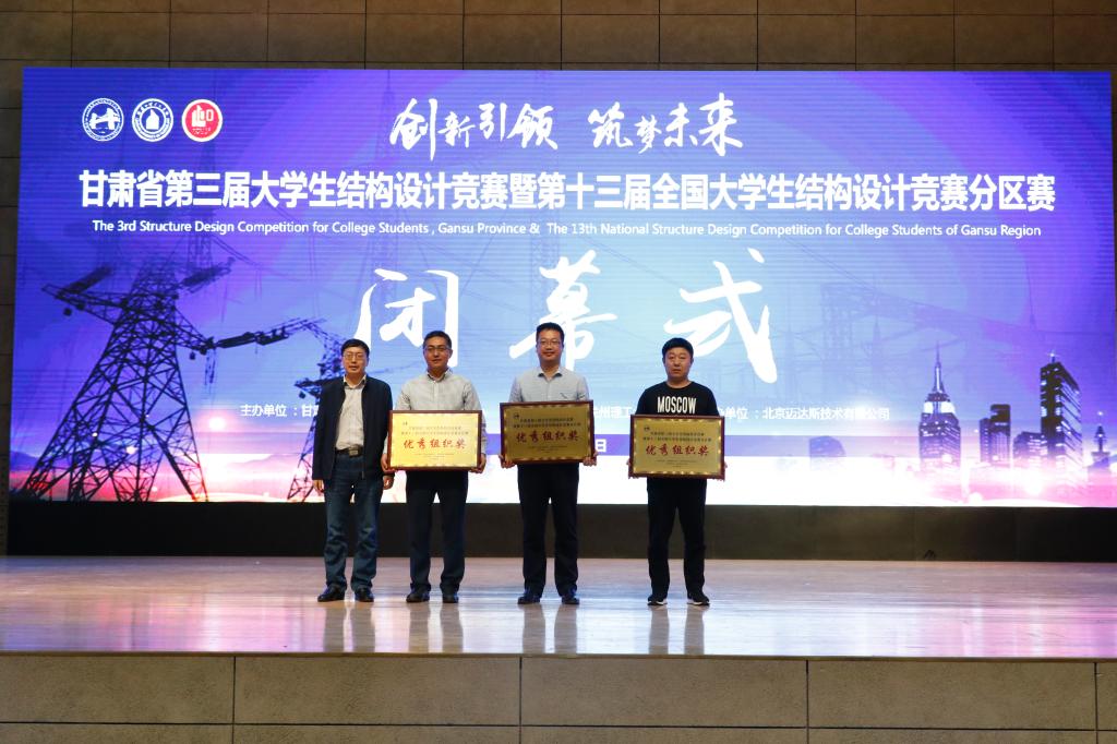 在加载环节结束之后,于下午5点闭幕式正式开始。闭幕式由兰州理工大学土木工程学院院长周勇教授主持。竞赛专家委员会主任蔺鹏臻教授从结构设计、研究方法、模型制作等方面对竞赛作品进行了全面深入的分析与点评,在肯定成绩的同时,指出了不足及改进之处,他希望同学们再接再厉,在不断实践中寻求新的突破,取得更优异的成绩。甘肃省教育厅高教处姜言卿副处长宣布了比赛结果,本届大赛共评选出一等奖3项,二等奖7项,三等奖10项,最佳创意和最佳制作奖各1项,优秀组织奖3项。经过评委会评选,获得大赛一等奖的是兰州工业学院第一代表队、兰州交通大学博文学院博文第一代表队、兰州理工大学纯净苍穹代表队,兰州大学乌堆代表队等7个代表队荣获二等奖,兰州大学木擎苍代表队等10个代表队荣获三等奖,甘肃林业职业技术学院大吉大利代表队等14支队伍活动优秀奖,兰州大学乌堆队荣获最佳制作奖,兰州交通大学致远队荣获最佳创意奖,兰州理工大学、兰州工业学院和兰州交通大学博文学院获得优秀组织奖。