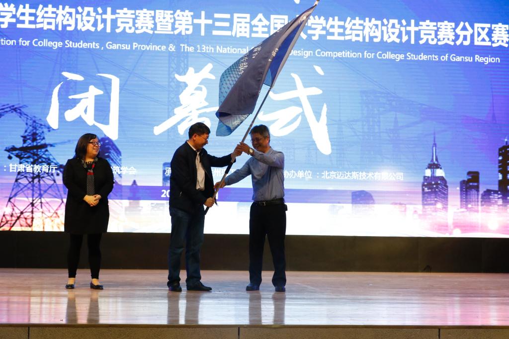 兰州理工大学王全进副校长、竞赛委员会秘书长虞庐松教授等领导嘉宾为获奖的参赛学生和单位颁奖。随后,经竞赛委员会决议2020年甘肃省第四届大学生结构设计竞赛将由西北民族大学承办,甘肃省教育厅高教处姜言卿副处长将竞赛赛旗授给下一届竞赛承办单位西北民族大学土木工程学院院长曹万智教授手中,完成会旗交接。曹万智教授代表西北民族大学参赛队向所有参赛学生和指导老师表示祝贺,向精心组织本次竞赛的兰州理工大学表示感谢。同时他代表学校向全省各高校发出了热情的邀请,并表示将学习以往高校的承办经验,努力承办好下一届全省大学生结构设计大赛。