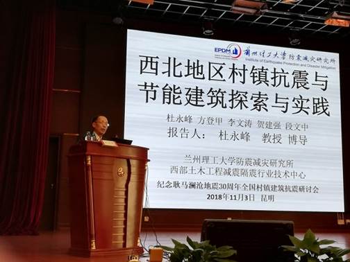 2018年11月2日至4日,纪念澜沧耿马地震30周年暨全国村镇防震减灾技术研讨会在昆明召开。来自哈尔滨工业大学、同济大学、四川大学、昆明理工大学、北京工业大学、华侨大学和兰州理工大学等20多所高校及中国建筑科学研究院、北京市建筑设计研究院等科研、设计单位的相关研究团队共200余人参加了学术研讨和工程应用观摩。中国建筑学会村镇抗震防灾专委会委员、兰州理工大学防震减灾研究所所长杜永峰教授参加了本届研讨会,应邀做大会报告,并担任分会主席。