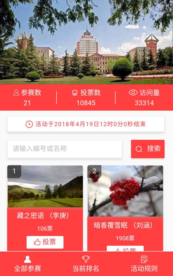 此次活动得到广大同学的积极响应,经过海选,入围的21个作品在4月18日至20日进入网络投票阶段,并在“兰州理工大学土木工程学院研究生会”微信公众号进行展示。参赛作品中《风光秀丽》和《美不胜收》,无一不展示了校区的独特风景,渲染了飞扬的青春,定格了校园落英缤纷的季节。经过激烈的角逐,曾媛同学以2575票获得第一名,刘涵、王鹏飞等同学也获得了可喜的成绩。本次比赛在全院师生中引起了强烈的反响,在我院掀起一股纪录生活的摄影风。至此,本次比赛在同学们高涨的热情中圆满结束。