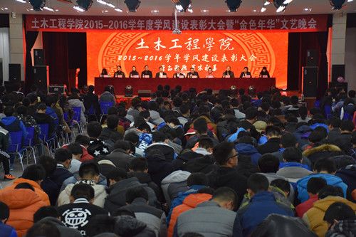 12月27日晚7点,学院在西校区大学生活动中心举办“2015-2016学年度学风建设表彰大会暨金色年华文艺晚会”。学院领导、各系主任、辅导员、班主任及2016级全体新生参加活动。会议由学院党委王玲副书记主持,