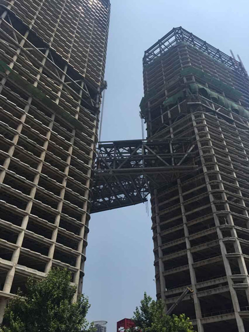 空中连桥连接办公楼与酒店塔楼桁架层,共3层,由2榀主桁架以及主桁架间的主次钢梁组成,单体重量约650吨,跨度40米,提升速度为每小时四米。工程重难点:空中连桥为异性结构,结构内部各桁架及钢梁受力不均;连桥相连的两座塔楼不等高,塔楼沉降不等,连桥端口定位难度大;空中连桥部分,连桥重量大,安装高度高,现场无法使用塔吊直接吊装到位;连桥结构整体提升高度达到106米,提升高度高,不确定因素多;连桥结构整体层数达到三层,且连接形式为刚接,现场对接难度大。本次连桥提升采用计算机智能控制液压顶升系统奖钢连桥整体提升至106米高度后进行安装,是该工程的一大亮点。