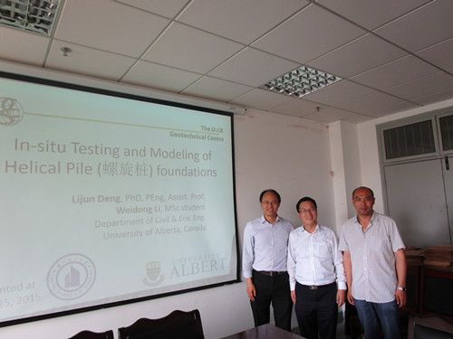 邓教授就“Testing and Modeling of Innovative Helical Pile Foundations”的研究做了精彩的讲解。同时,对Innovative Helical Pile Foundations的试验、数值模拟、理论分析及工业应用情况也做了介绍。邓教授在Innovative Helical Pile Foundations方面的研究成果,对我国冻土地区的管线等,特别是输油管线地基与基础的处理提供了新的方法和思路。邓教授就学院老师和研究生提出的问题进行了探讨。