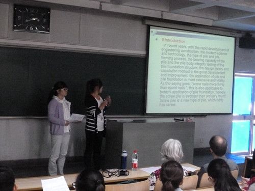 活动中,陈海龙、南娜娜、崔旺、张晓非、方登甲、余丽玲等组成的15个课外研究团队分别作了题为“Optimization of fame shear wall structure”、“Optimum design of reinforced concrete floor plate”等课外研究小论文的报告,介绍的内容包括螺纹桩、变截面斜梁、井式楼盖等结构及构件的优化设计等模型和思路。土木工程专业的周洲和冯治斌所同学所做的题为“基于实验现象的单筋矩形截面梁适筋破坏的M-Φ曲线的理论推导”和工程管理专业钟鸣同学所做的题为“压电发电片与人行道的组合及应用”课外研究,富有新意,展示了我校土木工程学子良好的学术探索能力。其中,彭翀、周洲、李静尧等同学的英语表达交流能力受到了参会专家的好评。
