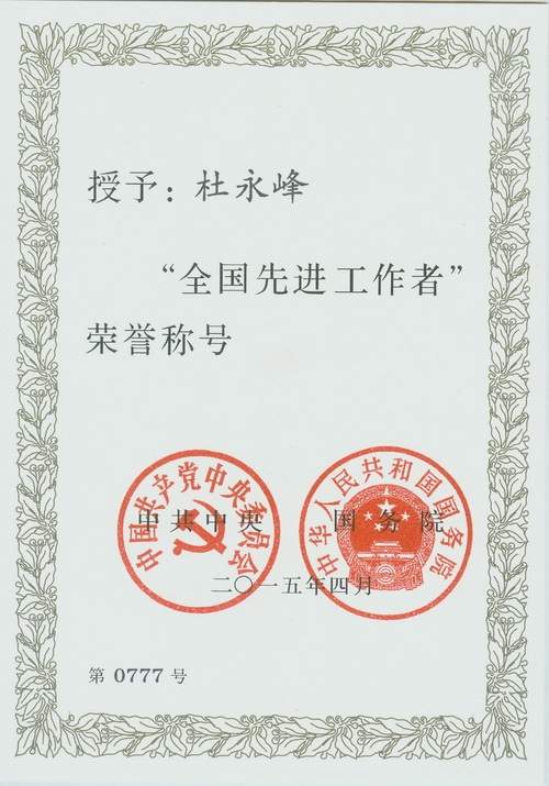 2015年4月28日,庆祝“五一”国际劳动节暨表彰全国劳动模范和先进工作者大会在北京人民大会堂隆重举行。中共中央总书记、国家主席、中央军委主席习近平发表重要讲话,李克强主持大会,张德江、俞正声、王岐山、张高丽出席,刘云山宣读表彰决定。本次大会共表彰2064名全国劳动模范和904名全国先进工作者,我校土木学院杜永峰教授喜获“全国先进工作者”荣誉称号。