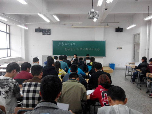 会上,辅导员樊老师结合近年来的考研、就业情况向大家重申了四六级考试的重要性,并宣布成立土木工程学院英语学习互助小组。会议要求各班级成立本班的英语互助小组,组长需由班级内部英语水平较高者担任,负责组织和督促本班学生学习英语,每周至少两次集体学习,每月进行一次模拟练习。