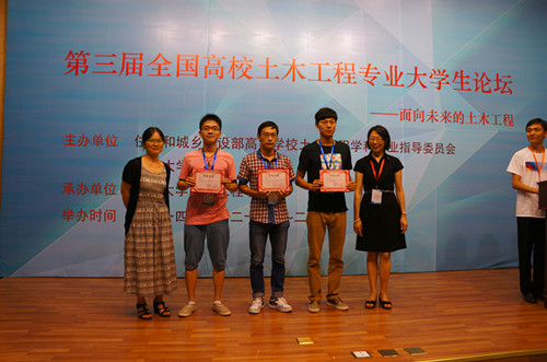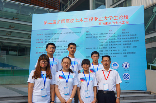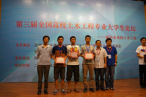 ,第三届全国高校土木工程专业大学生论坛在同济大学举行。我校土木学院方登甲同学的论文《关于兴隆寺挡土墙破坏的工程原因分析及加固可行性方案的研究》和李静尧、周龙、温利亚、崔旺同学的论文《震损底层框架房屋的最优替代传力路径研究》获得论坛优秀论文奖,张晓菲、方登甲等同学的作品荣获趣味结构赛三等奖。