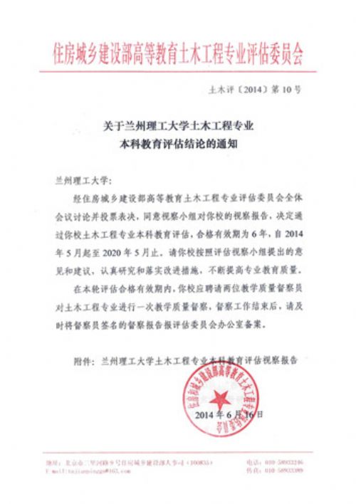 5月20日,学院正式收到住房城乡建设部高等教育土木工程专业评估委员会“土木评[2014]第10号”文件,该文件正式通知兰州理工大学土木工程专业2014年本科教育评估结论:合格有效期为6年,自2014年5月起至2020年5月止。这是我院土木工程学院专业建设的又一重大喜讯。对此,我们表示热烈的祝贺!