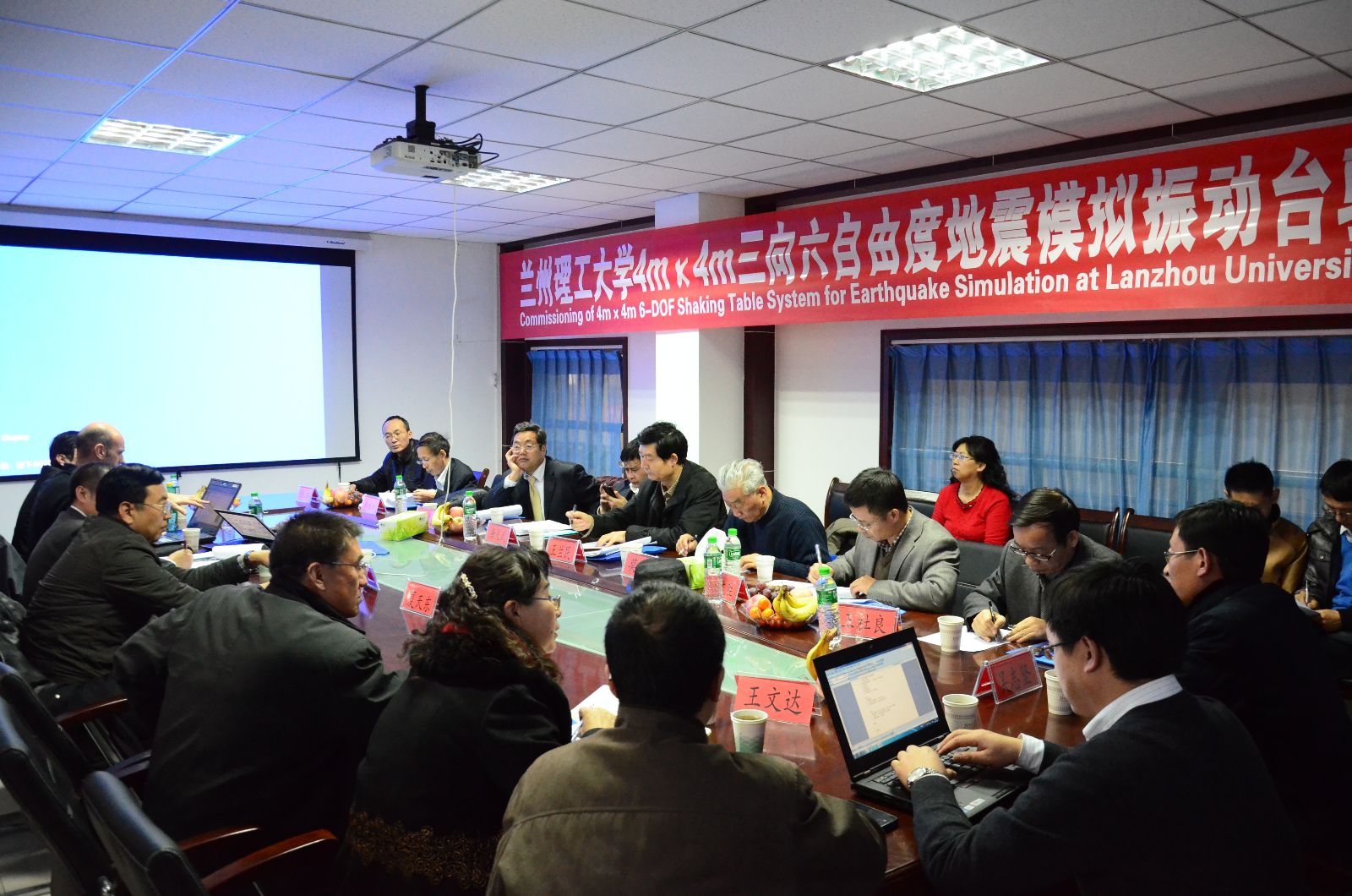 在准备验收会议阶段,学院精心准备,邀请在振动台建设、运行及使用方面的国内权威专家,包括甘肃省地震局局长王兰民研究员,同济大学结构工程与防灾研究所、土木工程防灾国家重点实验室振动台试验室主任卢文胜教授,甘肃省建筑设计研究院莫庸教授级高工,重庆交通科研设计院结构动力工程所所长、桥梁工程结构动力学国家重点实验室主任唐光武教授,西安建筑科技大学土木工程学院副院长王社良教授,组成以王兰民研究员为主任委员、卢文胜教授为副主任委员的验收专家委员会。12月8日的验收会议,专家委员会委员及其他校内外专家共同听取了生产制造商-SERVOTEST公司的振动台试验系统终验收测试结果报告,然后按照专家委员会的意见,考察了以地震波三向输入信号为主的现场试验,最后经过认真质询和讨论,形成了验收意见。认为该振动台系统有良好的地震模拟精度,一致同意通过验收。