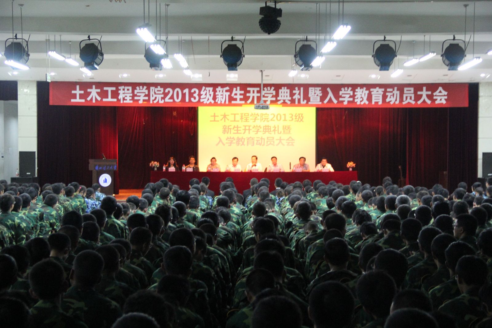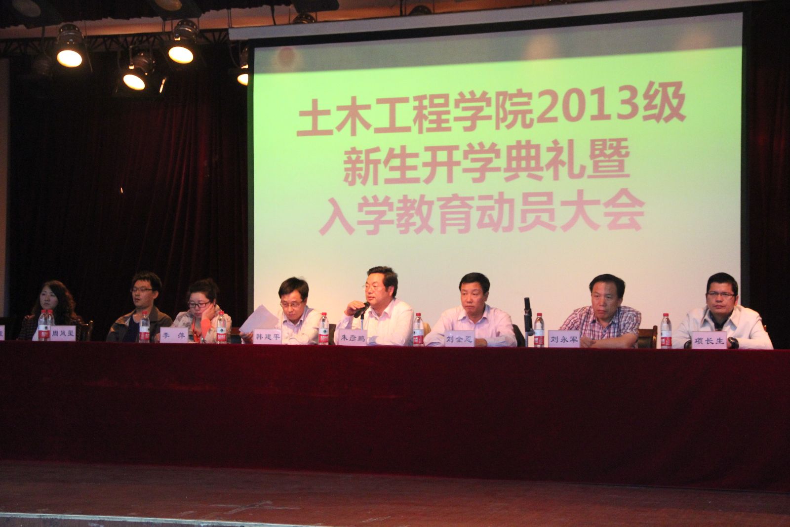 2013年9月15日晚7:30,兰州理工大学土木工程学院2013级新生开学典礼暨入学动员大会在西校区大学生活动中心隆重举行。开学典礼由韩建平副院长主持。土木工程学院朱彦鹏院长、党委刘全恩书记、副处级组织员刘永军老师、院长助理李萍教授、周凤玺老师、项长生老师、学生办公室主任张海霞老师、土木工程学院团委书记宋小涛老师及13级各辅导员、班主任、全体801名新生参加了开学典礼。