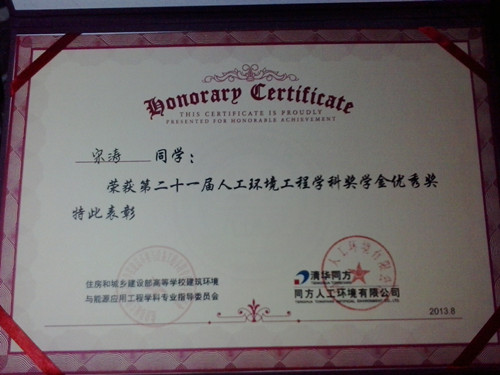 2013年8月18日至21日,我校土木学院建筑环境与能源应用工程专业2010级宋涛同学在北京参加了“第21届人环奖学金”决赛,并取得了优秀奖的好成绩,这是我校第一次正式参加该竞赛。