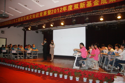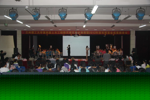 2012年5月8日,在全国第四个“防灾减灾日”来临之际,我校在西校区大学生活动中心举行了第四届土木工程防灾减灾知识竞赛决赛。甘肃省抗震办公室副主任雷永勤高工、甘肃省科学院地质自然灾害防治研究所所长王得楷研究员与学院400余名本科生、研究生现场观看了比赛。学院副院长韩建平教授、孙玉萍教授分别担任竞赛的裁判长和副裁判长,杜永峰教授、王文达教授及从事防灾减灾研究的部分教师组成竞赛裁判组。