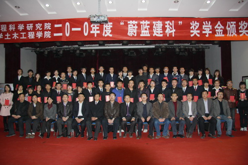 土木工程学院朱彦鹏院长宣读了《关于表彰甘肃土木工程科学研究院-兰州理工大学土木工程学院2010年度 “蔚蓝建科”奖学金获奖学生的决定》,出席颁奖典礼的领导为50名获奖学生颁发了获奖证书。