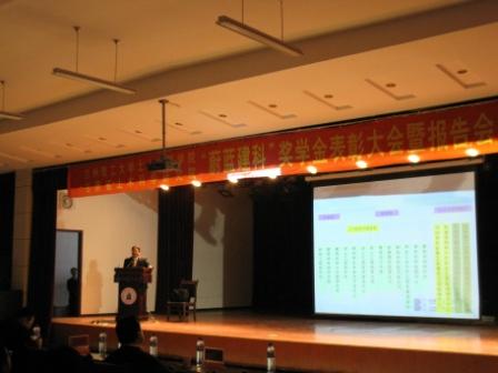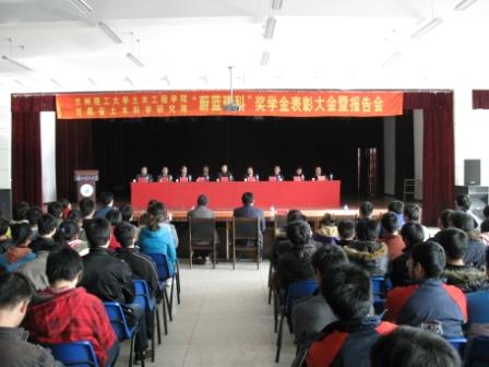 2010年1月8日下午,兰州理工大学土木工程学院、甘肃省土木科学研究院“蔚蓝建科”奖学金表彰大会暨报告会在西校区大学生活动中心隆重举行。兰州理工大学校长王晓明教授,甘肃省土木工程科学研究院院长何忠茂教授,甘肃省土木工程科学研究院副院长滕文川教授、杜雷教授,学校校办魏昆主任,学生处滕怀荣副处长,土木工程学院院长朱彦鹏教授,党委书记狄生奎教授等出席了大会。大会由土木工程学院党委副书记薛小勇主持。