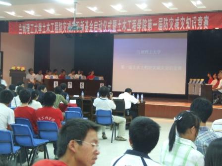 2009年5月10日,兰州理工大学西校区大学生活动中心成功举办了兰州理工大学土木学院第一届土木工程防灾减灾知识竞赛暨“双新”基金启动仪式。活动的主题为了解灾变规律,反思灾害代价,宣传防灾知识及探索新技术,培养新人才。活动由甘肃省抗震防灾协会、兰州理工大学土木工程学院主办,兰州理工大学防震减灾研究所承办,甘肃长实隔震器材有限公司和四川君德恒安隔震技术有限公司协办。本次活动出席嘉宾有:甘肃省建设厅设计处处长、省抗震办主任火宏教授级高工,甘肃省地震局专家马占虎,甘肃省电视台新闻部谈广灵主任,甘肃省长实隔震器材有限公司王翔总经理,四川君德恒安隔震技术有限公司寇卫东经理,兰州理工大学土木工程学院党委书记狄生奎副教授,兰州理工大学土木工程学院党委副书记薛小勇老师,兰州理工大学土木工程学院副处级组织员刘永军老师,西部土木工程防震减灾教育部工程研究中心副主任、兰州理工大学防震减灾研究所所长博士生导师杜永锋教授,兰州理工大学结构检测与加固研究所所长宋彧教授。土木工程学院部分教师、研究生和800余名本科生参加了本次活动。