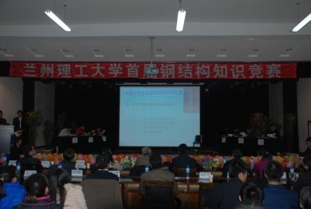 为激发同学们对钢结构课程的学习积极性,提高对专业知识的综合运用能力,结合《钢结构设计原理》国家级精品课程建设,兰州理工大学空间结构研究所全体教师和土木工程学院分团委学生会全体干部进过精心准备和周密安排,12月6日由兰州理工大学教务处、共青团兰州理工大学委员会、兰州理工大学实验管理处、土木工程学院和流体与动力工程学院主办,兰州理工大学空间结构研究所和土木工程学院分团委、学生会承办的“兰州理工大学首届钢结构知识竞赛”在兰州理工大学西校区大学生活动中心成功举办。甘肃省建设科技委员会常务副秘书长、甘肃省土木工程资深专家、教授级高级工程师莫庸先生,甘肃省冶金设计总工、钢结构专业委员会副主任陈天镭先生,兰州理工大学教务处周琦副处长,兰州理工大学实验管理处田治学处长,共青团兰州理工大学委员会吴学楷书记,土木工程学院朱彦鹏院长、薛小勇副书记、党星海副院长,兰州理工大学空间结构研究所所长王秀丽教授等多位专家领导莅临指导,并对本次竞赛给予了高度的评价。