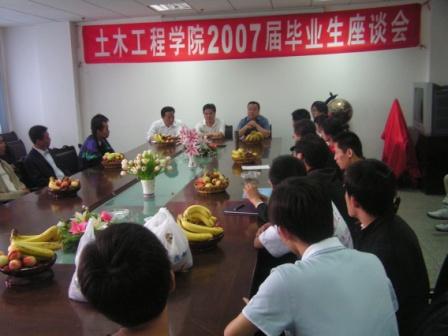 二〇〇七年六月二十一日,土木工程学院召开二00七届毕业生座谈会,座谈会在轻松和谐的氛围中进行。学院党委书记狄生奎、副书记薛小勇、副处级组织员刘永军及学院二00七届毕业生60多名师生参加了座谈会。座谈会由副书记薛小勇主持。
