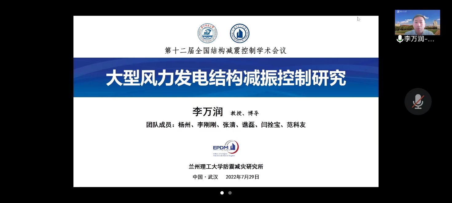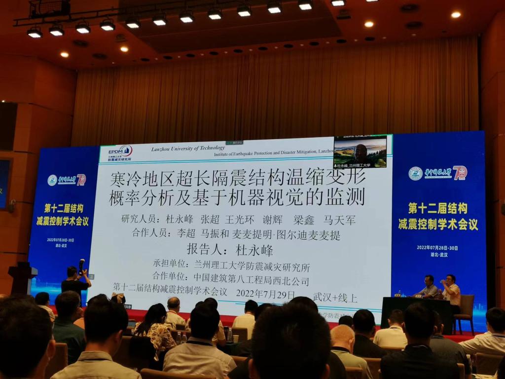 2022年7月29-30日由中国地震学会工程隔震与减震控制专业委员会和中国建筑学会抗震防灾分会主办,华中科技大学和控制结构湖北省重点实验室承办的第十二届结构减震控制学术会议在湖北武汉隆重召开。广州大学周福霖院士、哈尔滨工业大学欧进萍院士、湖南大学陈政清院士、华中科技大学丁烈云院士、同济大学吕西林院士等来自高校、科研院所、企事业单位共计近400位专家学者参加了此次会议。在此次会议上4位院士作了大会主题报告,其他专家学者做了18场大会特邀报告和88场分会场报告,线上直播累计观看人数达14505人。由于受疫情影响,我校防震减灾团队线上参加了此次会议。中国土木工程学会防震减灾工程分会副理事长杜永峰教授作了题为“严寒地区超长隔震结构概率损伤分析及基于机器视觉的监测”的大会特邀报告,并在兰州理工大学组织研究生设立线下分会场;李万润教授并作了题为“大型风力发电结构减振控制研究”的分会特邀报告;景伟副教授作了题为“基于改进TMD的能源设施储液罐减震控制研究”的分会场学术报告。