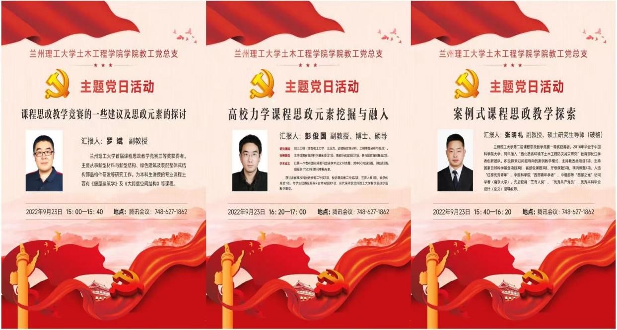 为落实立德树人根本任务,充分发挥高校课堂教学授业育人的主渠道、主阵地作用,推动广大教师切实履行职责、担当起“课程思政”主体责任,将思想政治教育有效渗透贯穿于教育教学全过程,充分发挥好专业课程的育人功能,近日土木工程学院教工党总支开展主题党日活动,邀请我院近两年在校级课程思政讲课竞赛中获奖的三位老师举行课程思政建设交流分享会。土木工程学院全体教师党员、学院新入职教师及兄弟学院的相关教师近90人线上参加了此次交流分享会。会议由甘肃省课程思政教学名师、土木工程学院道路与桥梁工程教师党支部书记李喜梅副教授主持。