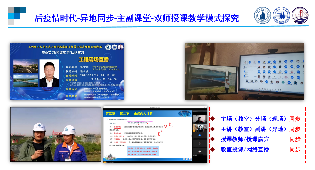 在线上线下同步混合式授课开始之前,道桥系就开展了一系列工作的准备。继“后疫情时代-异地同步-主副课堂-双师授课教学模式“之后,生动地把线下教室与线上直播同时进行的混合式授课模式,比喻做“主分会场”授课模式,学生分别在教室的主会场和在家的分会场,而教师相当于“一人就是一座电视台”,集导演、主持、导播身份,融线下互动和线上交流与一体。