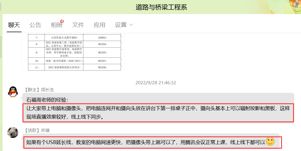 同时,老师们通过线上线下等方式,在系群、电话及办公室中也热烈交流自己的授课方式。例如,方式一:线上共享PPT,线下板书;方式二:笔记本电脑连接投影仪,教室多媒体电脑中使用另一个腾讯会议登录,可以随时关注线上学生的学习状况。