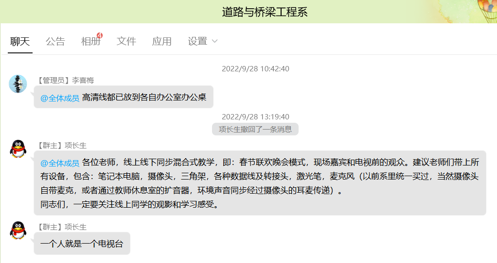 系主任项长生在QQ群及线下对老师们进行了培训,为老师们建议准备相关教学及辅助设备,形象生动地讲解了这种授课方式的过程。全系教师纷纷发挥主观能动性,根据自己课程及授课的特点,准备了笔记本电脑、HDMI高清线、高清摄像头、手写板、无线耳机、无线麦克等混合式授课所需的相关设备,并制定了相关策略。