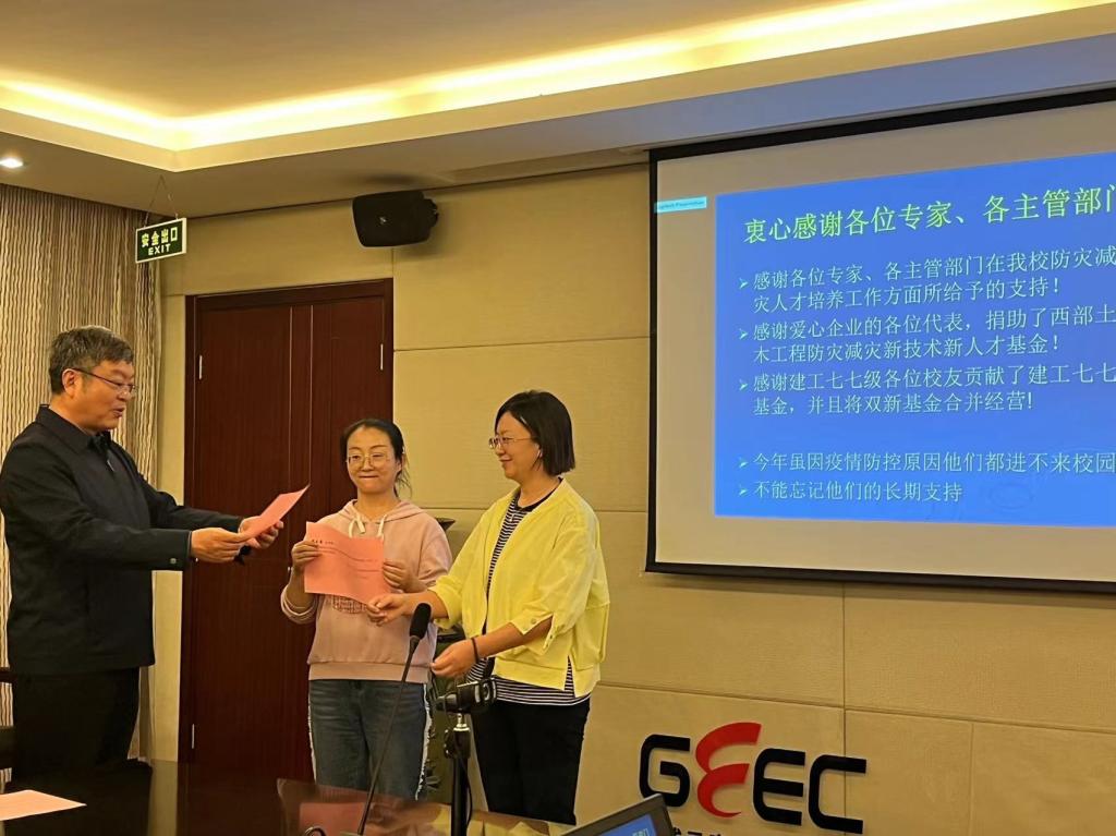 会议第二阶段由程选生秘书长主持。2018年年底以来,建工七七基金会与甘肃省减震隔震国际科技合作基地、土木工程学院等联合,为博士后留学生、土木工程专业优秀青年教师和部分优秀大学生设立三个层次的定向开放基金。本次参加开放基金申报答辩的张玉蓉在读博士、李琼博士、薛翠真博士及冯琼博士等土木学院青年教师分别就科研业绩、课题思路和个人科研发展方向等做了答辩,王景玄副教授结合原承担的由建工七七基金资助的国际科作基地开放基金进行结题答辩。2019级优秀本科生代表张婷婷同学线上答辩学生开放基金。建工七七级参会校友对答辩申请进行评审和投票,尚建忠、胡逸萍校友代表基金常务董事会宣布了评审结果并现场进行了颁奖仪式。